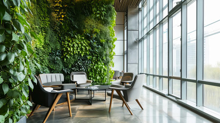 Title: Eco-Friendly Office Space with Vertical Green Wall and Modern Workspace