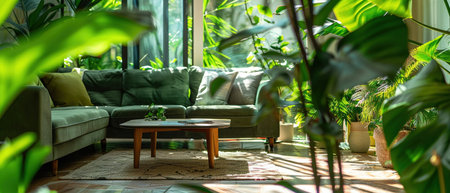 A tranquil living space featuring a green sofa surrounded by lush plants and large windows. Sunlight filters through, creating a serene atmosphere perfect for relaxation.
