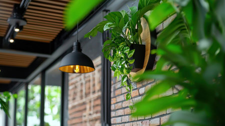 Cafe interior with elements of biophilic design. The concept of biophilia
