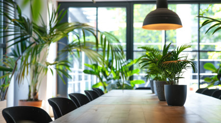 A modern conference room surrounded by lush greenery, featuring a sleek table and chairs, creating a refreshing and serene space for collaboration and meetings.