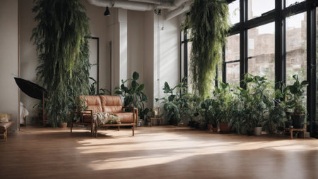 A bright and spacious loft filled with natural light, featuring cozy furniture and lush indoor plants, creating a serene and inviting urban living environment.