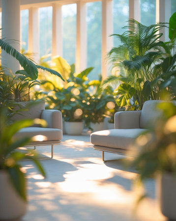 This image showcases a serene indoor space filled with lush green plants and cozy furniture, creating a tranquil atmosphere full of natural light.