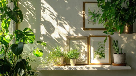 Sunlight pours through large windows casting gentle shadows on a collection of potted greenery that thrives in the inviting atmosphere. Textured wall hangings add depth to the.