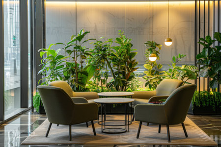 This stylish lounge features cozy armchairs and a minimalist coffee table, all set against a backdrop of vibrant greenery, creating a calming environment ideal for relaxation.