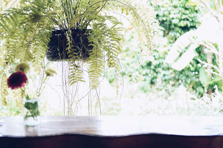 Wooden table and green plant in cozy room with sunlight from window