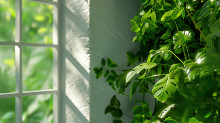 Sunlit Green Tropical Leaves in Modern Indoor Setting.