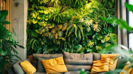Indoor garden with green plants and cozy sofa in a living room. Concept of home decor, indoor gardening, relaxation space, nature-inspired interior.