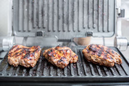 Delicious meat steaks on an electric grill cooked in the kitchen. Viewed from the side.
