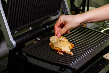grilling chicken with spices on the electric grill in the home kitchen
