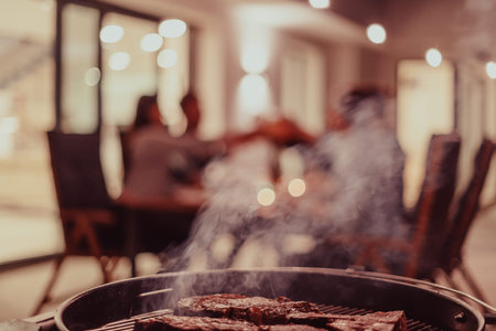 Close-up photo of delicious meat being grilled. In the background, friends and family are sitting and waiting for a meal.