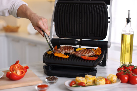 Man cooking meat and vegetables on electric grill in kitchen, closeup