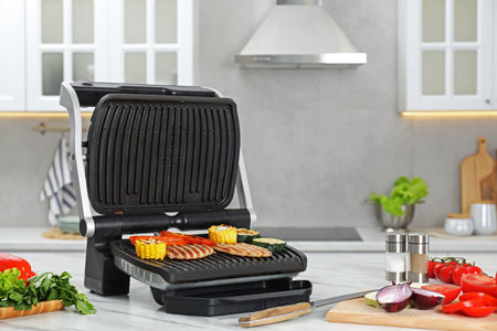 Electric grill with tasty meat and vegetables on white marble table in kitchen