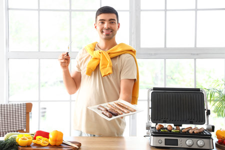 Young man with plate of tasty sausages cooked on modern electric grill at table in kitchen