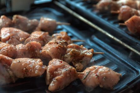 Skewers on skewers from raw meat of pork and beef, chicken cooked on a home electric grill. Top view. Selective focus. Blur