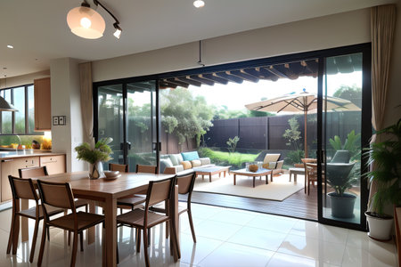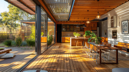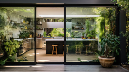 Sustainable Summer Modern Kitchen Interior with Outdoor Dining AreSteel Pendant Lights