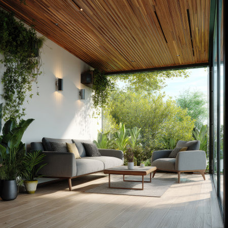 This image presents a modern outdoor living area featuring a sofa and armchair. The composition highlights a wooden ceiling and a backdrop of greenery. Soft lighting illuminates the scene, suggesting a relaxing environment. It could be used for architectural visualization or lifestyle design projects.