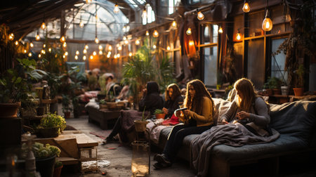 Immigrants in the dormitory, women sitting on the bed