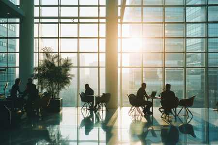 Bright modern office atrium photography of professionals in urban environment