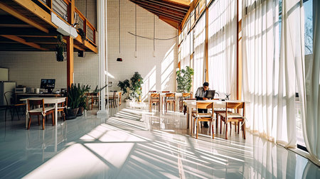 Co-Working Space interior design with minimalist style for work relaxation Sunlight. Concept of creative corporate work space for startup mobile office. Generative AI