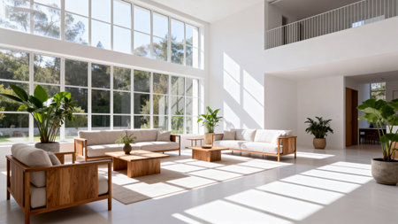 Modern living room with wooden floor and furniture, cozy atmosphere with natural light and green plants