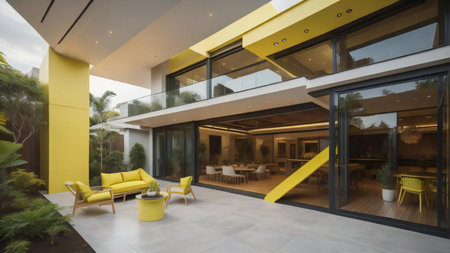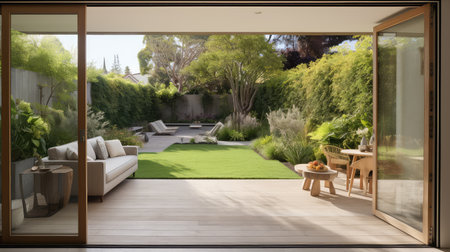 modern home door open illustration backyard garden, connect in, out spaces modern home door open