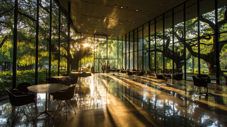 A tranquil cafe interior showcases a stunning play of light and shadows as sunlight streams through expansive glass windows, highlighting lush greenery outside.