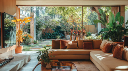 The expansive living room boasts a collection of vibrant orange sofas, lush greenery with various plants, and large glass windows that offer stunning views of the beautiful garden outside