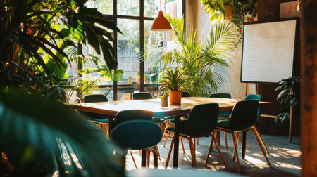 A stylish modern workspace featuring abundant greenery and natural light. The inviting atmosphere is perfect for meetings, brainstorming, or relaxation sessions.