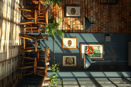 A view of a room with some chairs and pictures on the wall, AI