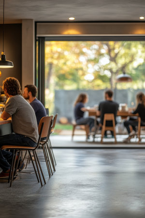 A serene cafe interior featuring stylish furniture and ample natural light. Perfect for relaxation or casual meetings in a modern setting.