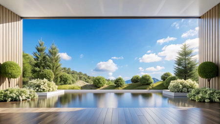 Modern, minimalist interior with panoramic view of a tranquil mountain landscape and pool. Large windows showcase the serene outdoor scenery, creating a seamless connection between indoor and outdoor spaces. Lush greenery and a calm pool reflect the surrounding nature, providing a peaceful ambiance. Wooden flooring complements the natural elements.