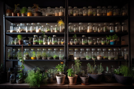 stacked shelves with jars of growing plants, each one a unique variety, created with generative ai