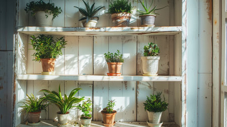Old wooden shelves painted white with pots of green plants. Gardening concept for storage. Generative AI.