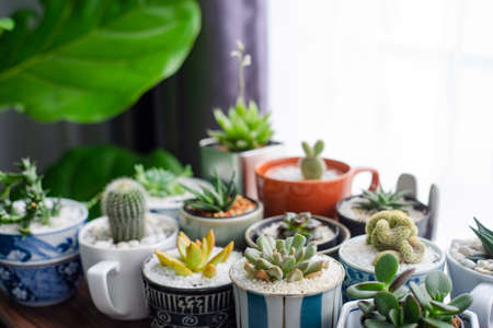Variety of cactus and succulent growth in pot on wooden shelf in shop. Small plant for home or office.