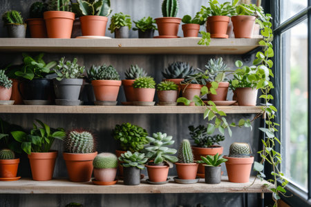 A collection of various plants neatly arranged on shelves, showing different shapes, sizes, and types. The greenery adds vibrancy to the indoor space, creating a visually appealing arrangement.