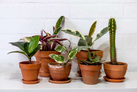 Indoor plants in clay terracotta pots. White brick background. Favorite hobby. garden center