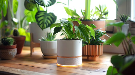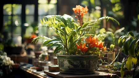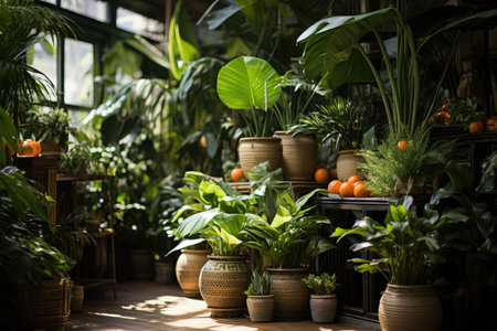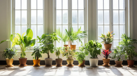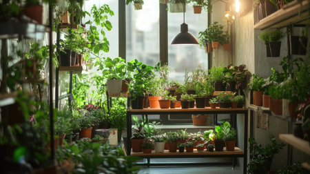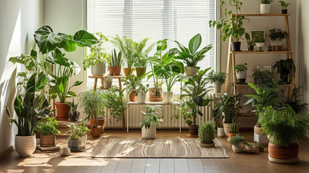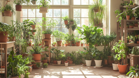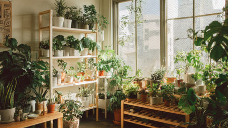 A bright interior filled with thriving indoor plants in decorative pots, showcasing household crop production and meticulous flower care. Natural light highlights the vibrant greenery.