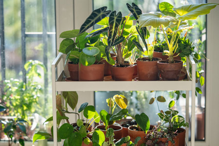 Indoor plants in clay pots on cart at home. Houseplants Alocasia, Philodendron Satin, Dischidia