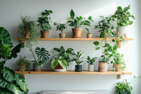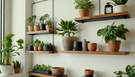 Transform your home into a peaceful oasis with this collection of potted plants displayed on clean wooden shelves. Create a fresh, modern, and tranquil space.
