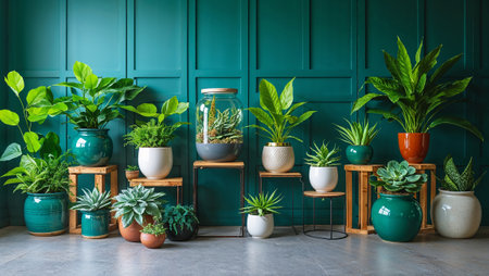 Potted plants and succulents decorating a modern teal room with wooden and metal plant stands. Ai generated image