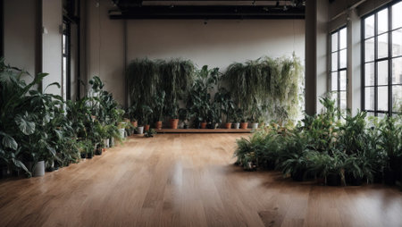 Interior of a room with green plants in pots and wooden floor