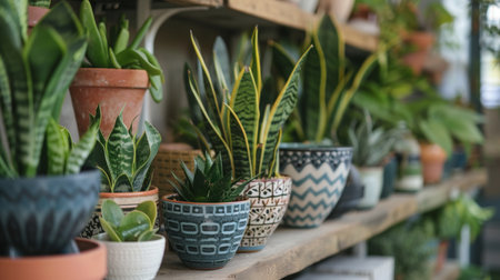 Variety of indoor plants in decorative pots arranged on shelves. Ideal for home gardening and interior design themes.