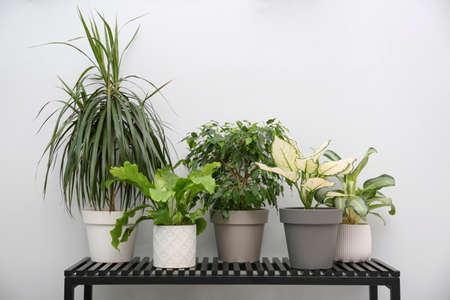 Various house plants in different pots against white wall. Indoor potted plants background with copy space. Modern room decoration.