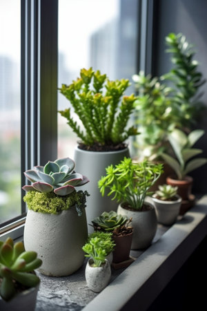 A bunch of plants in pots sitting on a window sill, AI