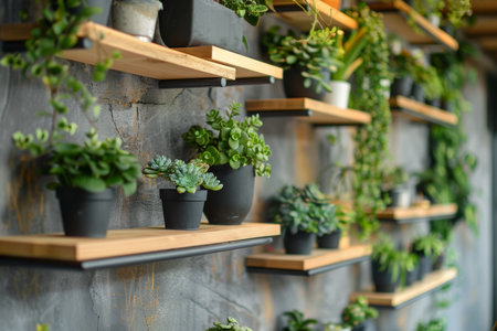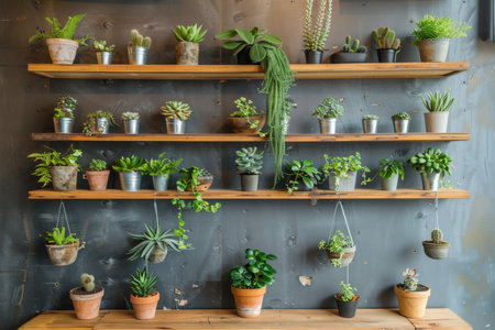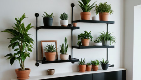 Botanical wall decor with greenery in pots on wooden shelves to enhance home and office spaces