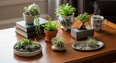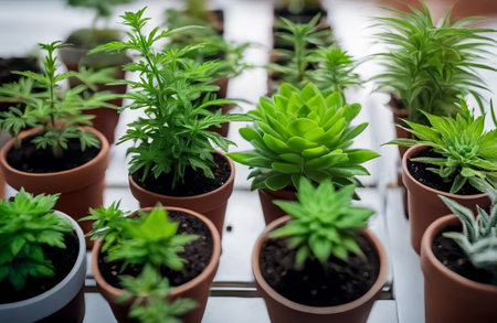Indoor garden with an assortment of plants growing in pots of different shapes and colors, carefully maintained in a well-lit room. Perfect for household farming enthusiasts.