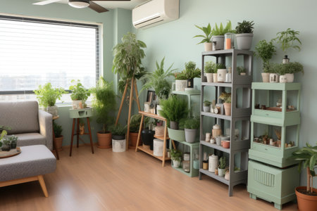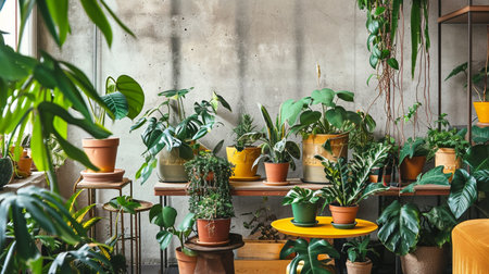 A stylish indoor garden with a wide array of potted plants, from succulents to leafy greens, in a well-lit room. A focus on flower care and household farming in a modern space.