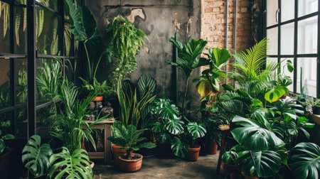 Stylish interior of with many different houseplants Interior with plants in living room on the floor. Composition of home garden plants industrial green interior. Urban jungle interior with houseplants.