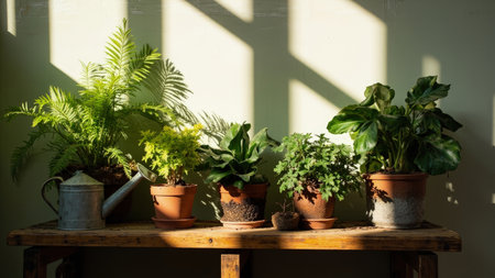 A captivating collection of lush green houseplants thrives in rustic terracotta pots, arranged artfully on a warm wooden table. Bathed in sunlight and soft shadows, the plants showcase vibrant green foliage, including delicate ferns and textured leaves. This image evokes a sense of tranquil nature and growth, perfect for illustrating home decor, gardening, or promoting eco-friendly living and wellbeing. Ideal for use in lifestyle blogs, interior design projects, and materials focused on indoor plants.