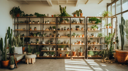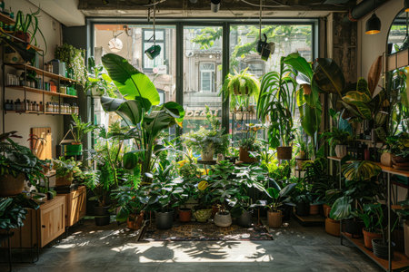 A lively plant shop showcases a variety of vibrant plants and greenery, with ample sunlight streaming through large windows on a bright afternoon.